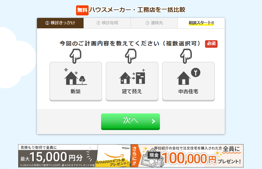 だから、この2件の注文住宅一括見積りサイトを利用すると、希望の家づくりと、それに合わせた土地探しを、うまくすり合わせながら出来るので、トントン拍子に注文住宅建築の計画が進むのがポイント!